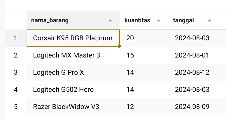 LIMIT 5:Membatasi hasil query hanya pada 5 baris pertama. Jadi, hanya 5 barang dengan kuantitas terbesar yang akan ditampilkan.