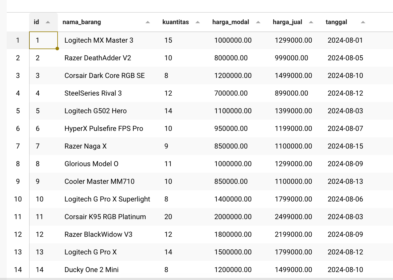 kuantitasdalam urutan menurun (descending). Ini berarti bahwa barang dengan kuantitas terbesar akan muncul terlebih dahulu dalam hasil. Kata kunciDESCsingkatan dari "descending" atau menurun.