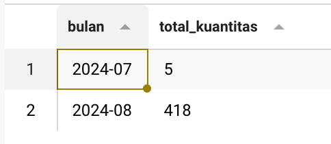 Selanjut manager kita meminta kita untuk menampilkan total kuantitas barang berdasarkan bulan. Untuk manampilkan total kuantitas barang berdasarkan bulan bisa menggunakan query berikut ini: