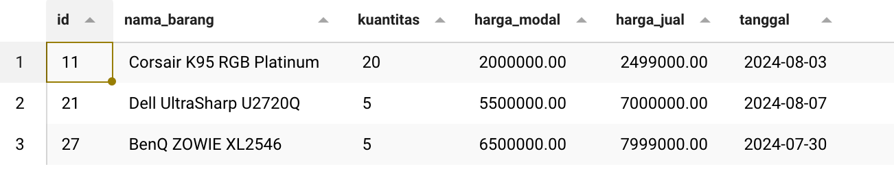 Selanjutnya kita mendapatkan kabar bahwa ada 2 barang yang sudah tidak ada didalam gudang, barang tersebut adalah Origin EON15-X dan MSI GT80 Titan yang sudah laku terjual. Jadi kita diminta untuk menghapus 2 barang tersebut dari database. Untuk menghapus data tersebut manager meminta kita menghapusnya berdasarkan ID dengan ketentuan seperti dibawah ini: